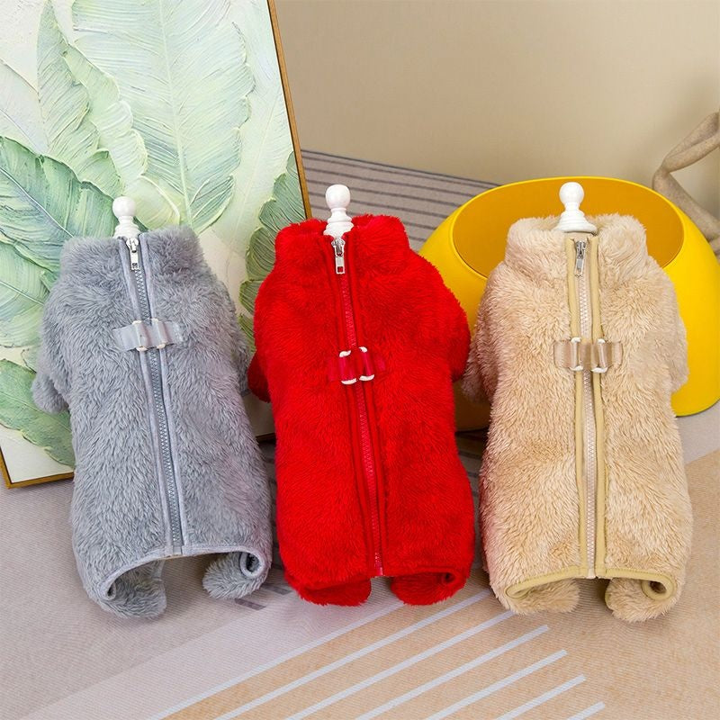LUXURIOUS CORAL VELVET FABRIC: Made from soft and cozy coral velvet, this jumpsuit coat provides exceptional warmth and comfort, perfect for keeping your dog snug during cold winter days.