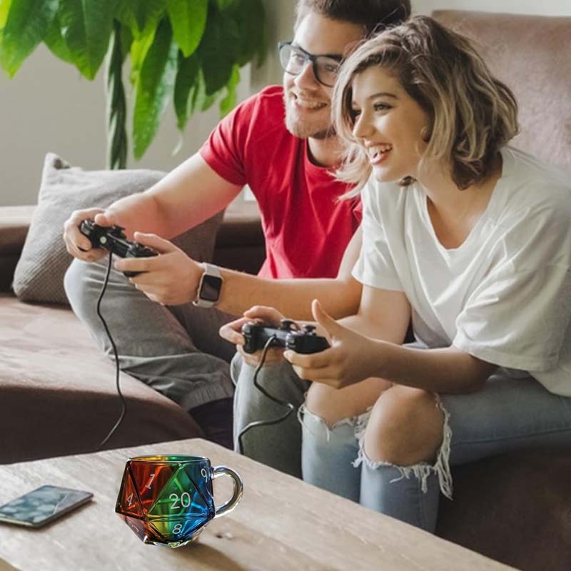 Package Include: 1 * Rainbow Glass D20 Dice Mug with Handle
